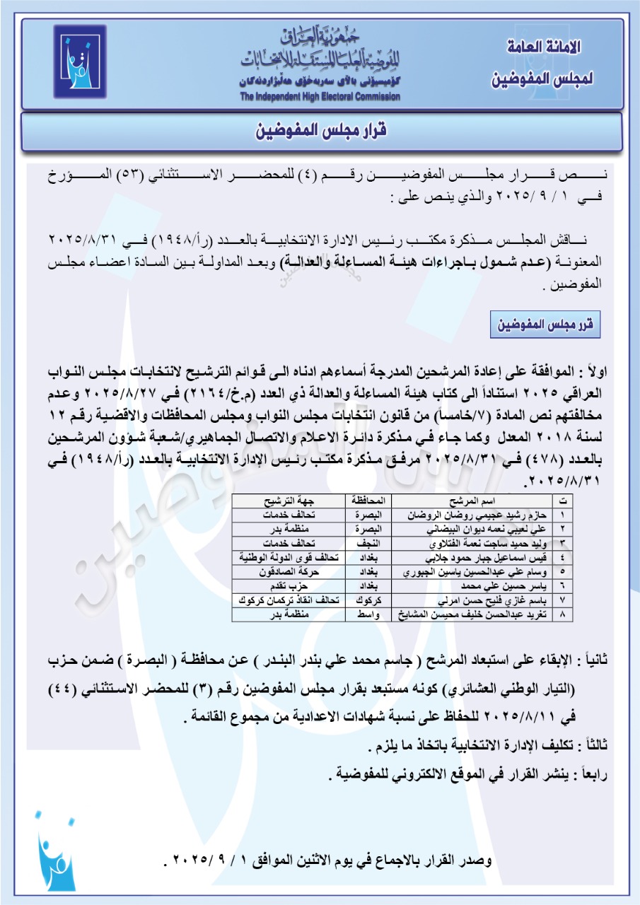 قرار مجلس المفوضيـن رقم (4) للمحضر الاستثنائي (53) المـؤرخ فـــي 2025/9/1